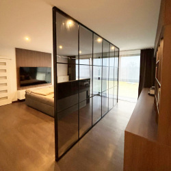 - the basic price includes a door leaf with selected glass, sliding system (rail height 33mm) with possible anchoring to the wall or ceiling with 2 slow stops no groove in the floor, just place a T-pin on the edge of the opening)