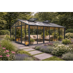 The greenhouse represents the perfect combination of traditional garden craftsmanship and modern architecture. Its elegant steel structure, expansive glass panels, and clean lines create a luxurious space that becomes a true centerpiece of any garden.