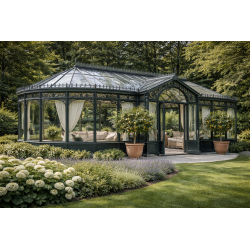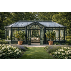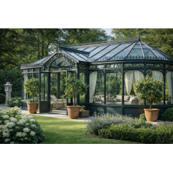 Bring timeless elegance and the romantic atmosphere of a castle garden to your outdoor space with this exclusive Victorian greenhouse, inspired by the historic orangeries of the 19th century. This decorative greenhouse captivates at first glance with its richly ornamented metal framework, gracefully domed roof, and expansive glass panels that allow maximum natural light inside.