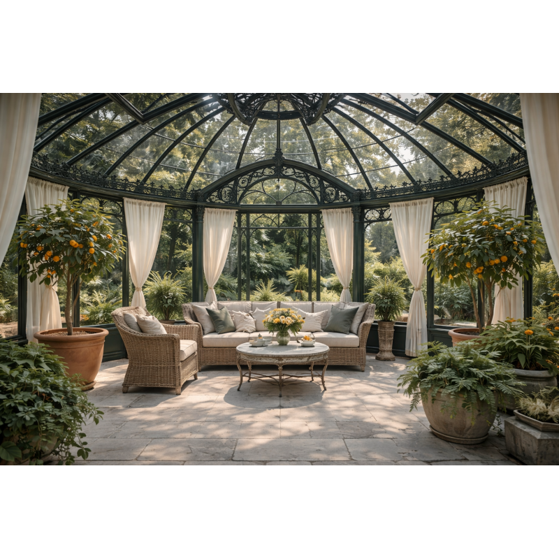 Perfect not only for cultivating citrus trees, exotic plants, or flowers, it also serves as a stylish garden pavilion for relaxation, afternoon tea, or unforgettable romantic celebrations.